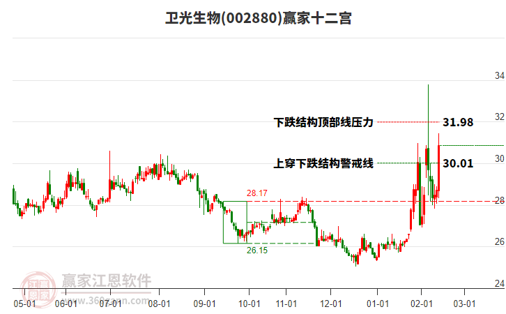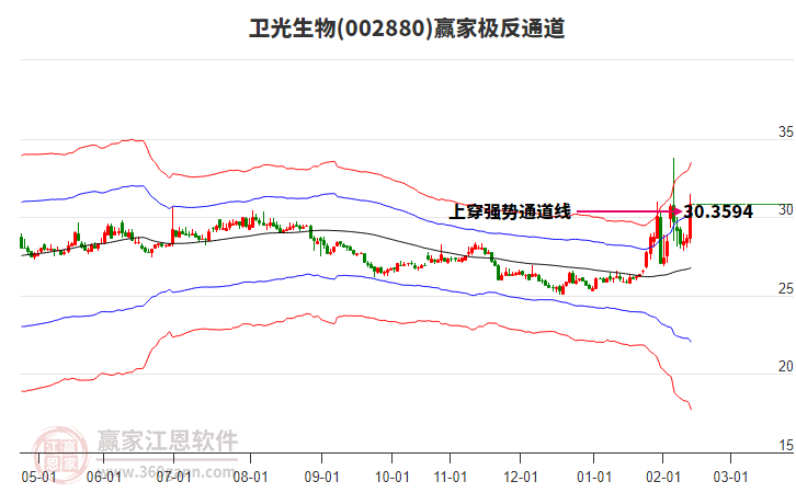 當(dāng)天002880衛(wèi)光生物最高價(jià)30.98上穿了贏家極反通道工具上方紅色外軌線,受到上方紅色外軌線強(qiáng)力壓制,最終收盤停留在在上方紅色外軌線與藍(lán)色外軌線上方的超強(qiáng)通道區(qū)域。002880衛(wèi)光生物近10個(gè)交易