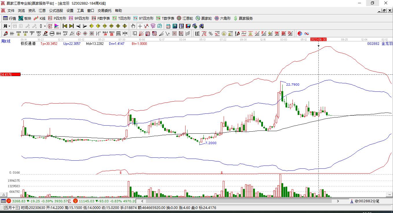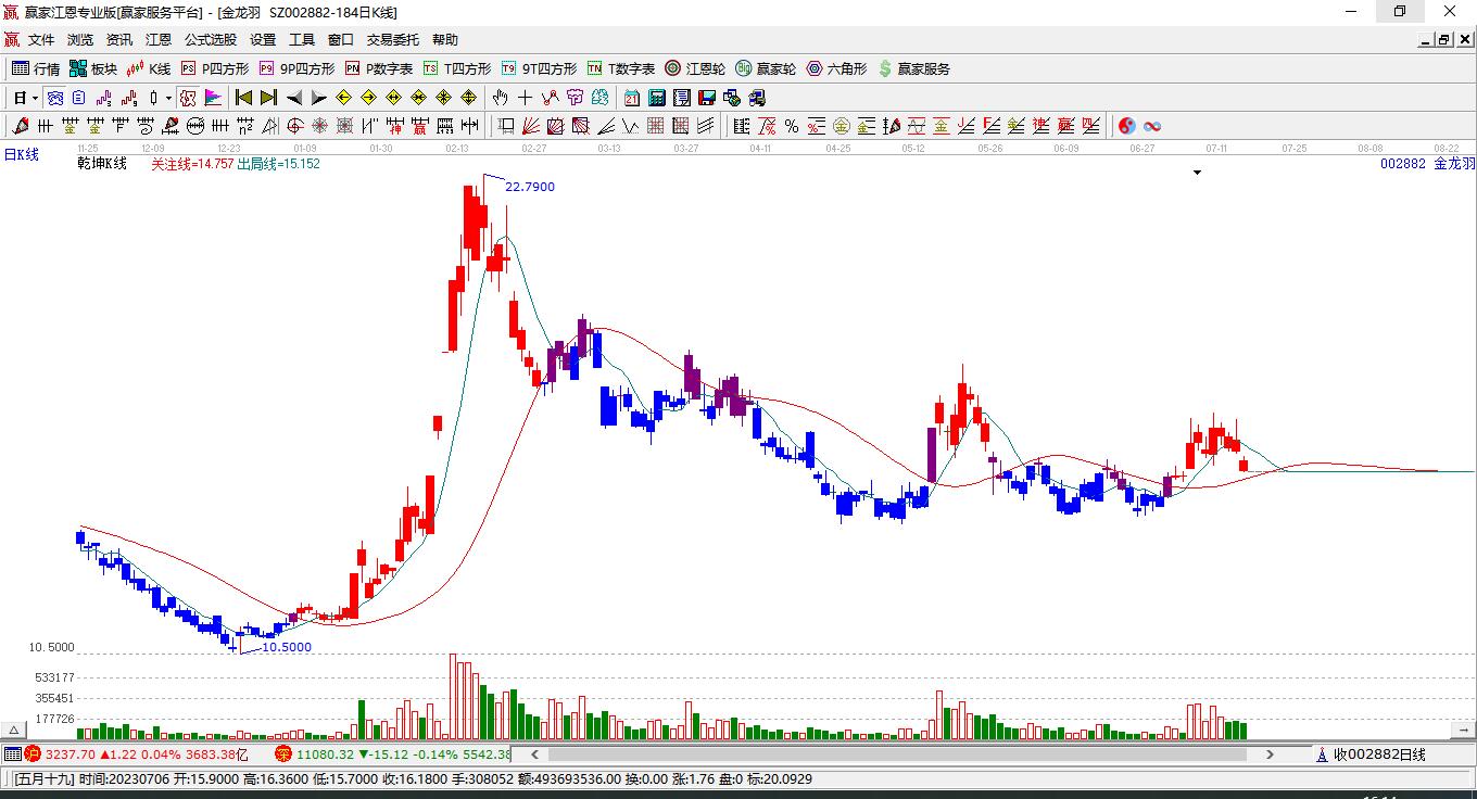 金龍羽(002882)從高點37.62,持續(xù)回調(diào)了7天,近期處于下跌趨勢