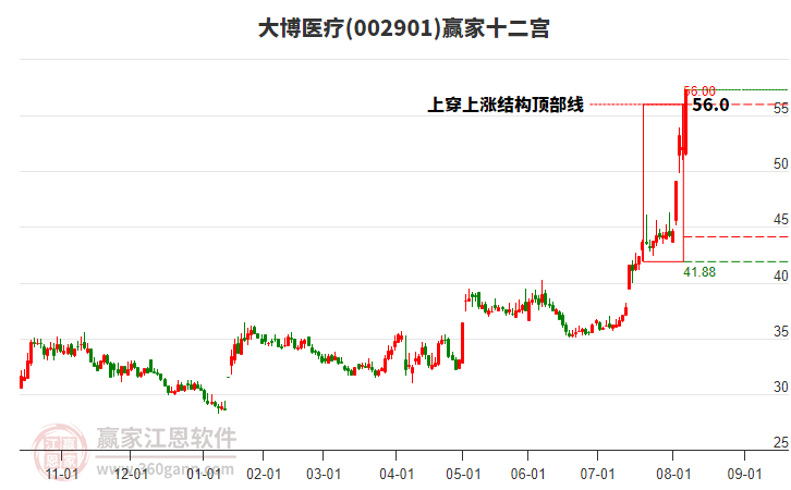 002901大博醫(yī)療處于贏家江恩多頭主線形態(tài),從9月23日形成底分型后持續(xù)上攻,今日突破前高形成初次江恩筑底信號,中長期多頭趨勢依舊保持。大博醫(yī)療今日跳空高開,截止目前K線上影小陽線,上漲能量較為強勢