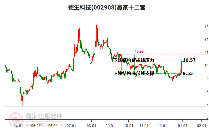 德生科技處于贏家江恩多頭次主線形態(tài),從1月12日形成頂分型后持續(xù)下跌,重心下移,今日跌破前低形成短期初次筑頂信號,短期多頭趨勢已被破壞,中長期多頭趨勢依舊保持。德生科技今日跳空低開,目前K線呈現(xiàn)上影小