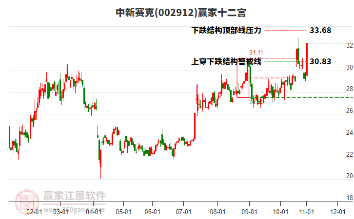 002912中新賽克根據(jù)贏家江恩極反通道趨勢工具展示,上方壓力位34.7107,下方支撐位30.2121。002912中新賽克處于贏家江恩多頭主線形態(tài),從12月5日形成底分型后持續(xù)上攻,今日突破前高形