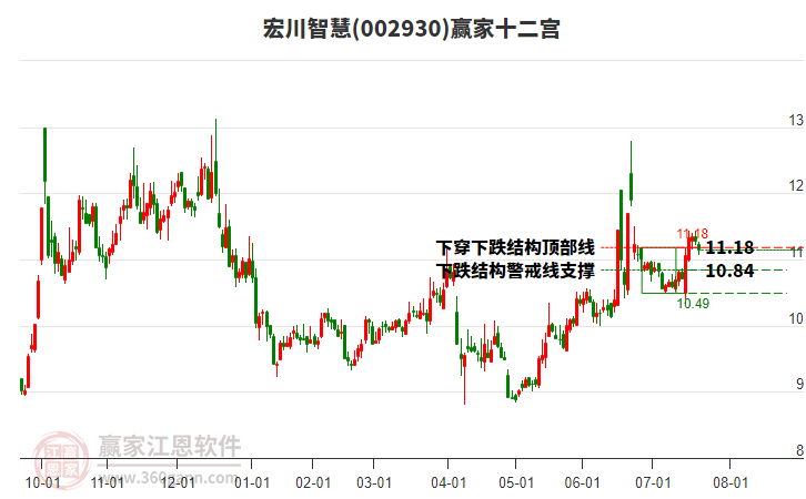 002930宏川智慧處于贏家江恩空頭主線形態(tài),從12月11日形成頂分型后持續(xù)下跌,今日形成短期初次筑頂信號(hào),短期多頭趨勢(shì)已被破壞,中期多頭反彈趨勢(shì)延續(xù),但長(zhǎng)期處于下跌中。宏川智慧今日跳空低開(kāi),截止目前