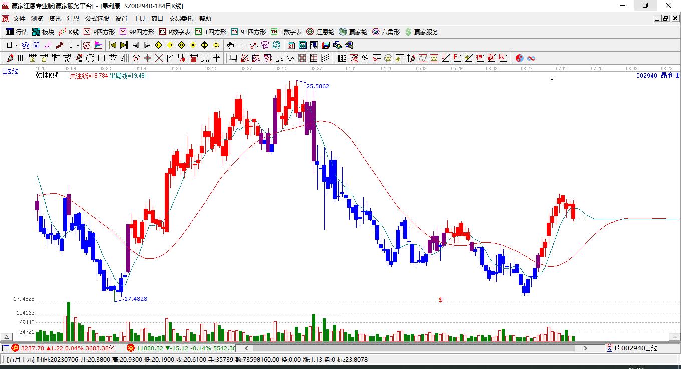 依據(jù)贏家江恩乾坤K線工具展示,本周K線以陰線收盤,目前股價處于藍色區(qū)域,位于關注線下方,關注線對當前股價形成壓制,短期看空。后市如若股價有效突破空頭出局線,則有望形成短期反彈(如不能突破空頭出局線,趨勢依然看空)。如跌破近期低點,后市將會進一步下探。
