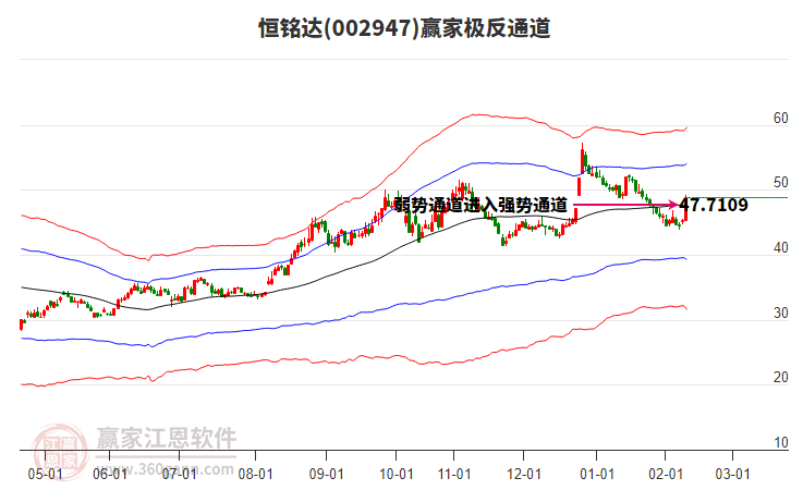 依據(jù)贏家江恩系統(tǒng)趨勢工具極反通道分析判斷恒銘達(dá)002947運行在生命線以上強勢區(qū)域,根據(jù)規(guī)則該股可短線、波段結(jié)合操作;結(jié)合物極必反的原理通過分鐘圖做盤中差價,應(yīng)用口訣是:生命線上強勢走,生命線下難抬頭;紅黃兩條外軌線,壓力支撐顯勢頭。