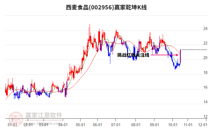 今天002956西麥?zhǔn)称飞洗┧{(lán)色外軌線 以上影小陽(yáng)線收盤
