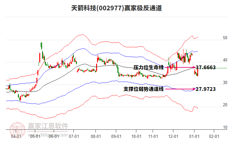 依據(jù)贏家江恩系統(tǒng)趨勢工具極反通道分析判斷天箭科技002977運行在生命線以下弱勢區(qū)域,根據(jù)規(guī)則該股短線輕倉參與,股價跌至弱勢外軌線后波段再結(jié)合其它工具信號建倉。應(yīng)用口訣是:生命線上強勢走,生命線下難抬頭;紅黃兩條外軌線,壓力支撐顯勢頭。