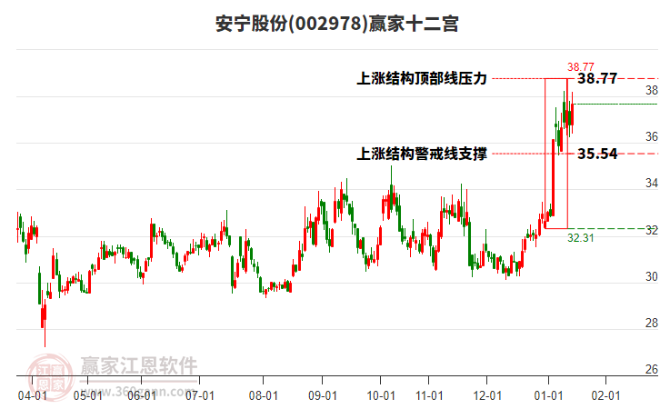 安寧股份002978今天,以強(qiáng)勢(shì)漲停收盤,近30個(gè)交易日漲幅17.66%,目前K線上穿前方上漲結(jié)構(gòu)頂部