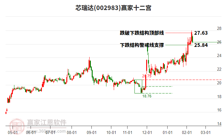 002983芯瑞達(dá)根據(jù)贏家江恩極反通道趨勢(shì)工具展示,上方壓力位25.599,下方支撐位22.2778。002983芯瑞達(dá)處于贏家江恩多頭次主線形態(tài),從1月26日形成頂分型后持續(xù)下跌,重心下移,今日跌破