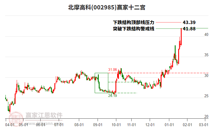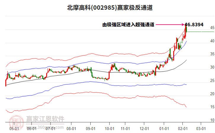 周二002985北摩高科最高價(jià)39.93挑戰(zhàn)了贏家極反通道工具上方紅色外軌線,受到上方紅色外軌線強(qiáng)力壓制,最終收盤停留在在上方紅色外軌線與藍(lán)色外軌線上方的超強(qiáng)通道區(qū)域。002985北摩高科近10個(gè)交易