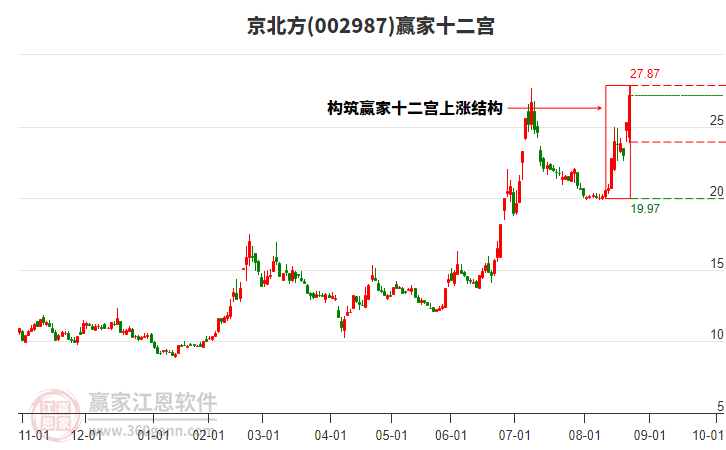 依據(jù)贏家江恩系統(tǒng)趨勢工具極反通道分析判斷京北方002987運行在生命線以上強勢區(qū)域,根據(jù)規(guī)則該股可短線、波段結(jié)合操作;結(jié)合物極必反的原理通過分鐘圖做盤中差價,應用口訣是:生命線上強勢走,生命線下難抬頭;紅黃兩條外軌線,壓力支撐顯勢頭。