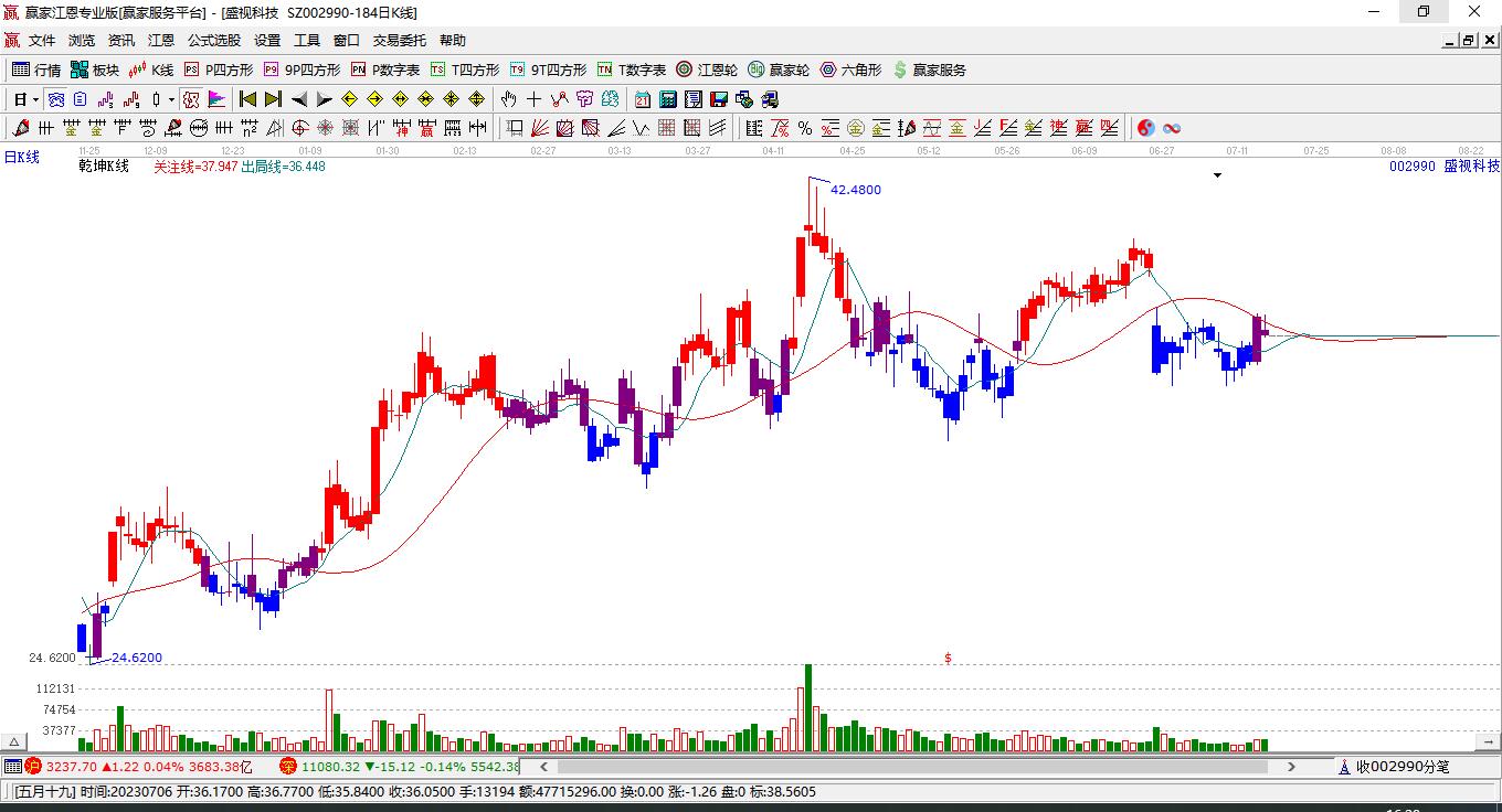 盛視科技(002990)處于贏家江恩多頭次主線形態(tài),1月6日發(fā)出江恩筑底信號后,經(jīng)過21日,今日形成短期筑頂信號,短期多頭趨勢已被破壞,中長期多頭趨勢依舊保持。盛視科技今日跳空低開,截止目前K線呈現(xiàn)上