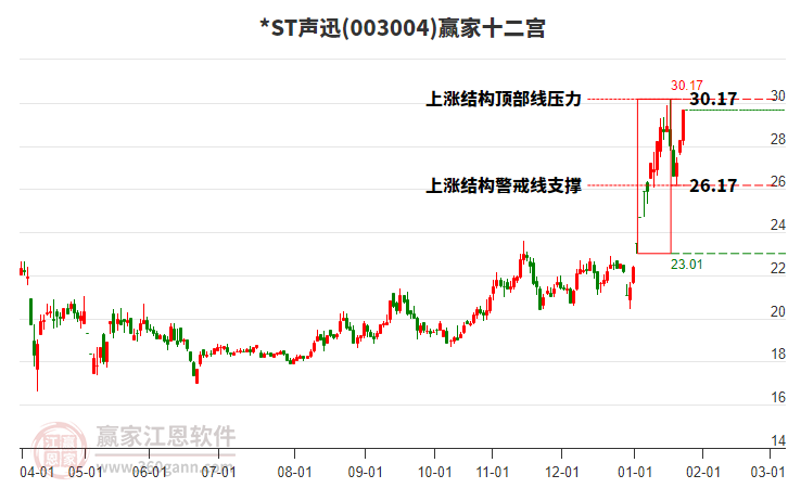 *ST聲迅處于贏家江恩空頭中期反彈形態(tài),從1月27日形成頂分型后持續(xù)下跌,重心下移,今日跌破前低形成短期初次筑頂信號,短期多頭趨勢已被破壞,中長期多頭趨勢依舊保持。*ST聲迅根據(jù)贏家江恩極反通道趨勢工