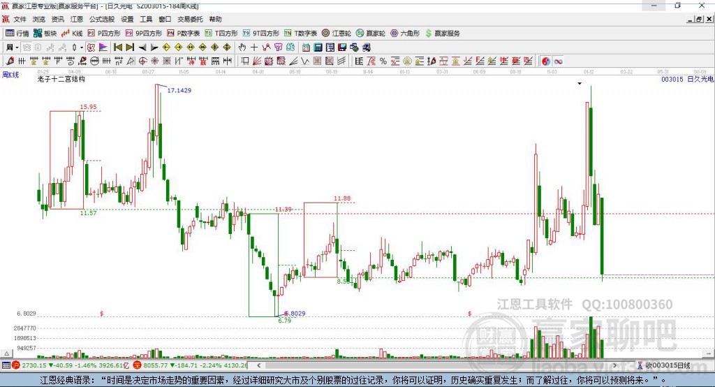 003015日久光電處于贏家江恩多頭中期回調(diào)形態(tài),9月29日發(fā)出江恩筑頂信號(hào)后,經(jīng)過(guò)70日,今日再次發(fā)出江恩底分型并發(fā)出江恩筑底信號(hào),中期多頭反彈趨勢(shì)延續(xù),但長(zhǎng)期處于回調(diào)中。日久光電截至目前K線為上影