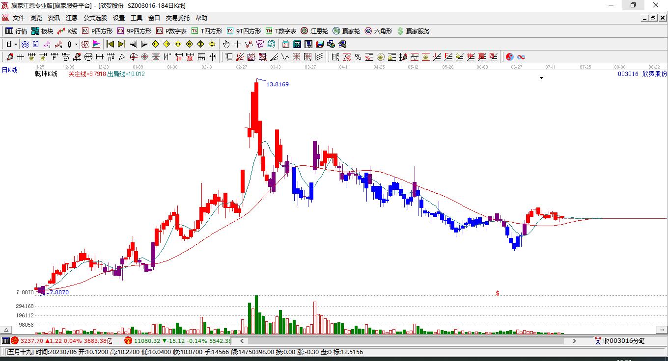 欣賀股份(003016)今日漲停,突破黃金價(jià)格分割工具壓力位10.2元