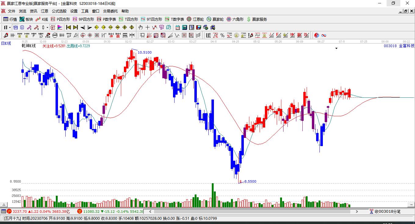 金富科技003018今天一字板漲停,今日突破藍(lán)色上軌線