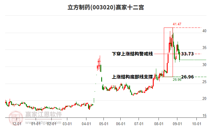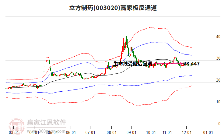 依據(jù)贏家江恩系統(tǒng)趨勢工具極反通道分析判斷立方制藥003020運(yùn)行在生命線以下弱勢區(qū)域,根據(jù)規(guī)則該股短線輕倉參與,股價跌至弱勢外軌線后波段再結(jié)合其它工具信號建倉。應(yīng)用口訣是:生命線上強(qiáng)勢走,生命線下難抬頭;紅黃兩條外軌線,壓力支撐顯勢頭。