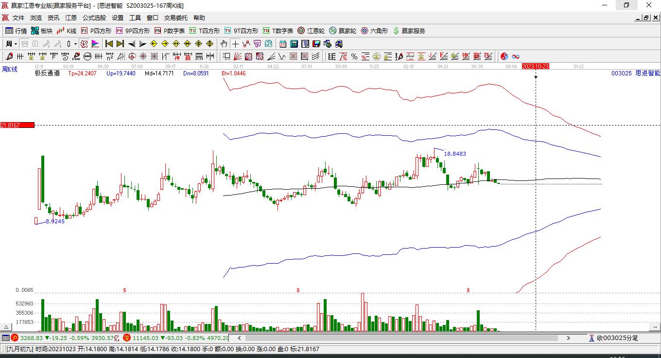 003025思進(jìn)智能處于贏家江恩多頭主線形態(tài),從12月17日形成底分型后持續(xù)上攻,今日突破前高形成初次江恩筑底信號,中長期多頭趨勢依舊保持。思進(jìn)智能今日低開,截止目前小幅上漲2.17%,K線為小陽線,