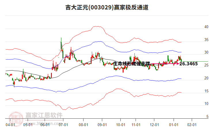 依據(jù)贏家江恩系統(tǒng)趨勢(shì)工具極反通道分析判斷吉大正元003029運(yùn)行在生命線(xiàn)以下弱勢(shì)區(qū)域,根據(jù)規(guī)則該股短線(xiàn)輕倉(cāng)參與,股價(jià)跌至弱勢(shì)外軌線(xiàn)后波段再結(jié)合其它工具信號(hào)建倉(cāng)。應(yīng)用口訣是:生命線(xiàn)上強(qiáng)勢(shì)走,生命線(xiàn)下難抬頭;紅黃兩條外軌線(xiàn),壓力支撐顯勢(shì)頭。