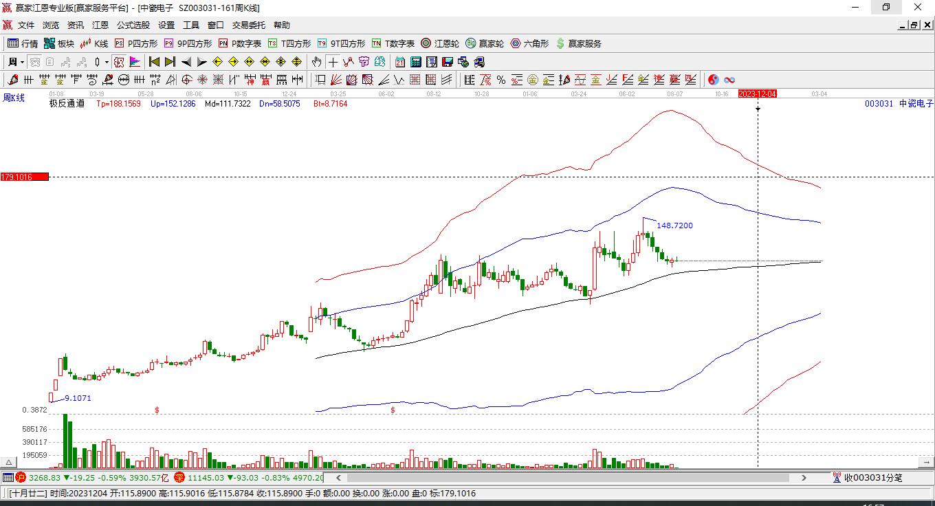 003031中瓷電子處于贏家江恩多頭次主線形態(tài),12月9日發(fā)出江恩筑底信號(hào)后,經(jīng)過42日,今日形成短期筑頂信號(hào),短期多頭趨勢(shì)已被破壞,中長(zhǎng)期多頭趨勢(shì)依舊保持。中瓷電子今日跳空低開,截止目前K線呈現(xiàn)穿頭