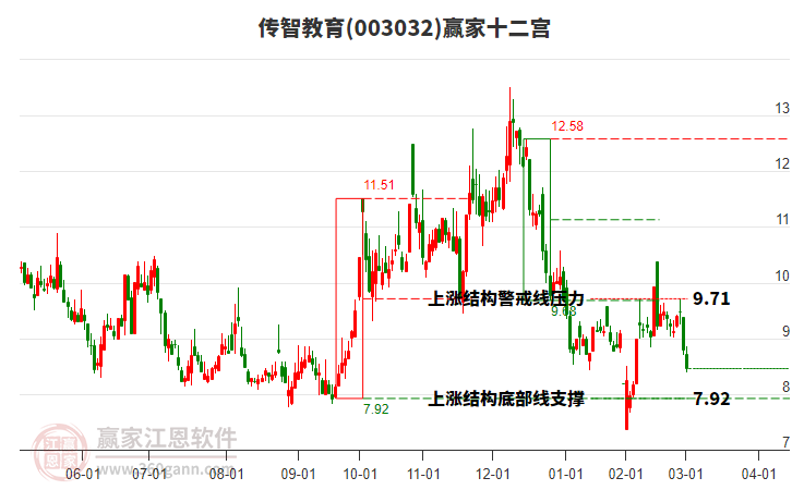 依據(jù)贏家江恩系統(tǒng)趨勢(shì)工具極反通道分析判斷傳智教育003032運(yùn)行在生命線以下弱勢(shì)區(qū)域,根據(jù)規(guī)則該股短線輕倉(cāng)參與,股價(jià)跌至弱勢(shì)外軌線后波段再結(jié)合其它工具信號(hào)建倉(cāng)。應(yīng)用口訣是:生命線上強(qiáng)勢(shì)走,生命線下難抬頭;紅黃兩條外軌線,壓力支撐顯勢(shì)頭。