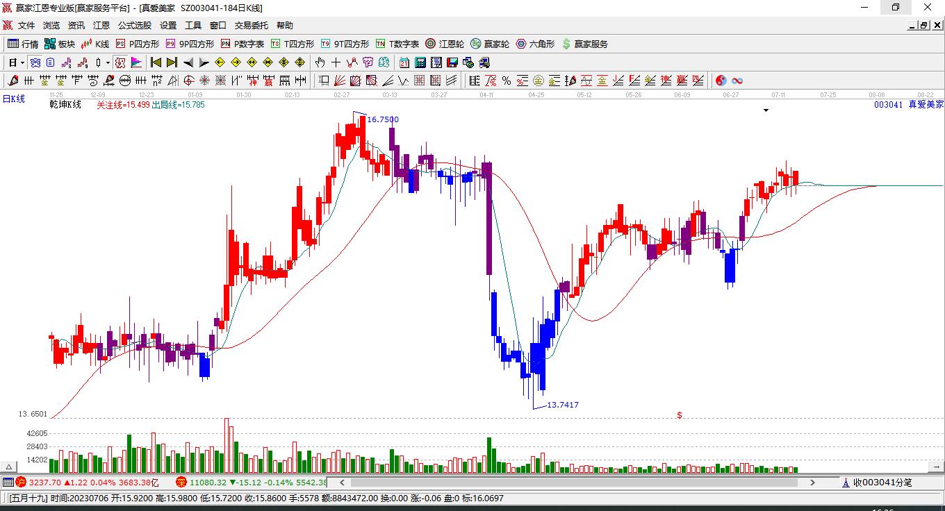 真愛美家(003041)處于贏家江恩多頭主線形態(tài),2月3日發(fā)出江恩筑頂信號(hào)后,經(jīng)過6日,今日再次發(fā)出江恩底分型并發(fā)出江恩筑底信號(hào),中長(zhǎng)期多頭趨勢(shì)依舊保持。真愛美家今日雖高開,截止目前股價(jià)低于昨日收盤價(jià)