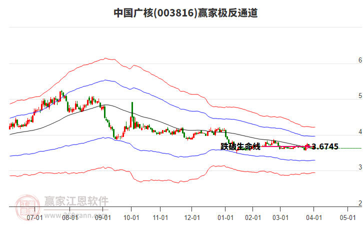 依據(jù)贏家江恩系統(tǒng)趨勢工具極反通道分析判斷中國廣核003816運行在生命線以下弱勢區(qū)域,根據(jù)規(guī)則該股短線輕倉參與,股價跌至弱勢外軌線后波段再結(jié)合其它工具信號建倉。應(yīng)用口訣是:生命線上強勢走,生命線下難抬頭;紅黃兩條外軌線,壓力支撐顯勢頭。
