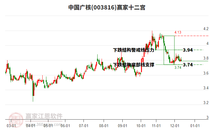 2月13日股價處于2025年12月1日形成的下跌結(jié)構(gòu)底部線3.74上方區(qū)域,該股自近期高點3.95跌至今日3.83,跌幅3.13%。依據(jù)贏家十二宮多空能量守恒規(guī)則,若股價不能有效站穩(wěn)底部線,下方多空能量平衡位需結(jié)合前方贏家十二宮結(jié)構(gòu)尋找。