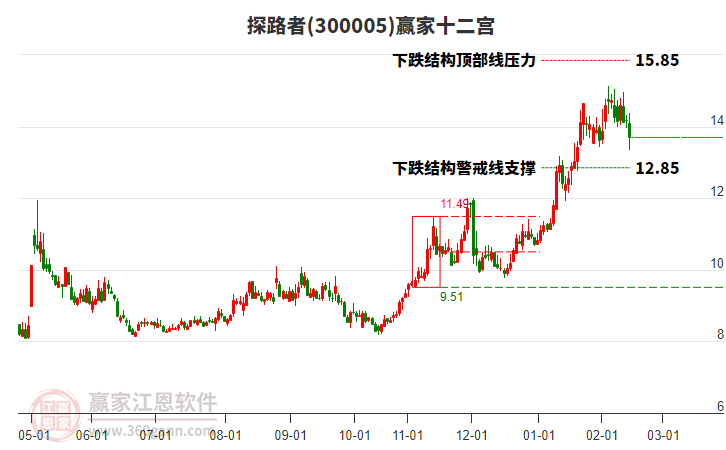 探路者處于贏家江恩多頭主線形態(tài),從12月16日形成底分型后持續(xù)上攻,今日突破前高形成初次江恩筑底信號(hào),中期雖然處于回調(diào)中,但長期多頭趨勢(shì)延續(xù)。探路者根據(jù)贏家江恩極反通道趨勢(shì)工具展示,上方壓力位11.7
