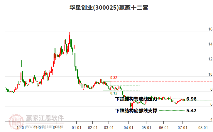 依據(jù)贏家江恩系統(tǒng)趨勢工具極反通道分析判斷華星創(chuàng)業(yè)300025運行在生命線以下弱勢區(qū)域,根據(jù)規(guī)則該股短線輕倉參與,股價跌至弱勢外軌線后波段再結合其它工具信號建倉。應用口訣是:生命線上強勢走,生命線下難抬頭;紅黃兩條外軌線,壓力支撐顯勢頭。