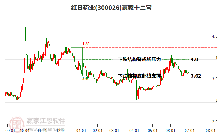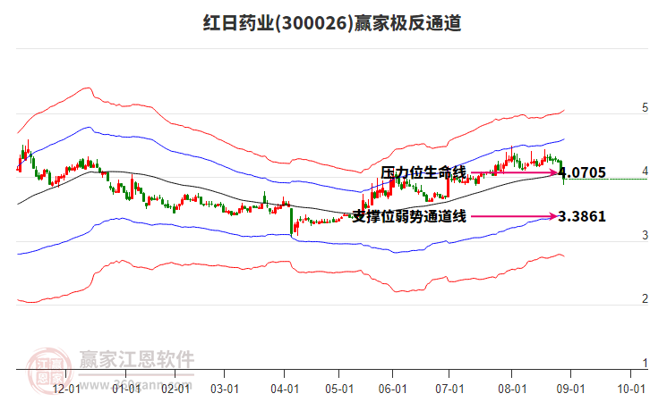300026紅日藥業(yè)根據(jù)贏家江恩極反通道趨勢工具展示,上方壓力位3.6548,下方支撐位3.2253。300026紅日藥業(yè)處于贏家江恩空頭主線形態(tài),從1月26日形成頂分型后持續(xù)下跌,今日形成短期初次筑