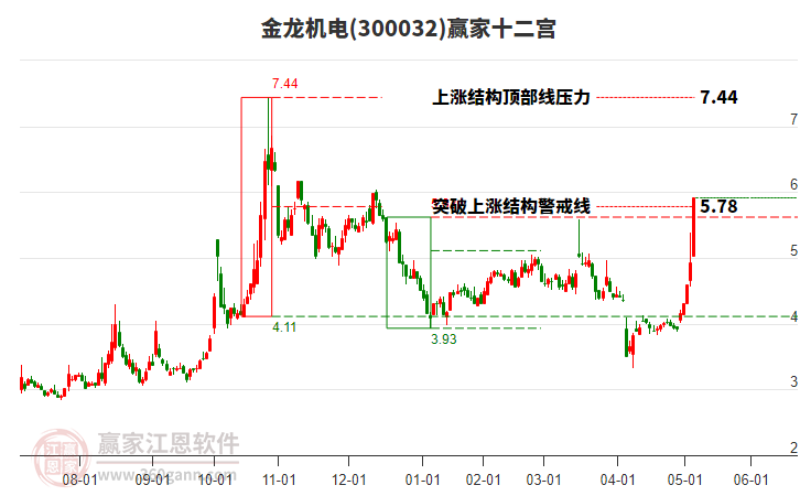 金龍機(jī)電(300032)處于贏家江恩多頭主線形態(tài),從1月16日形成底分型后持續(xù)上攻,今日突破前高形成初次江恩筑底信號(hào),中長期多頭趨勢(shì)依舊保持。金龍機(jī)電(300032)根據(jù)贏家江恩極反通道趨勢(shì)工具展示,