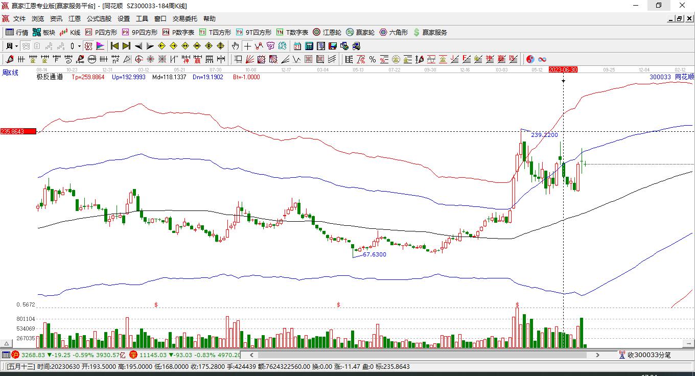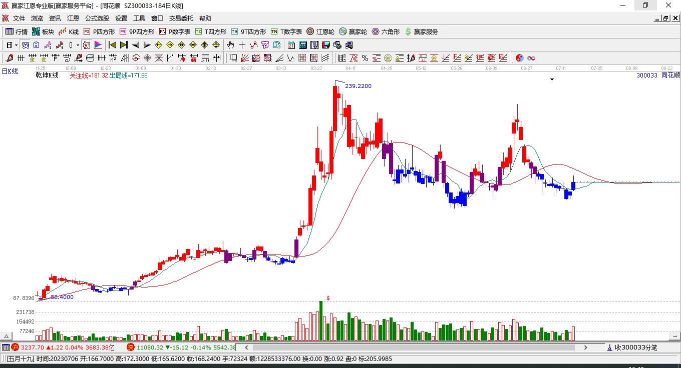 300033同花順處于贏家江恩多頭次主線形態(tài),1月5日發(fā)出江恩筑底信號后,經(jīng)過21日,今日形成短期筑頂信號,短期多頭趨勢已被破壞,中長期多頭趨勢依舊保持。300033同花順根據(jù)贏家江恩極反通道趨勢工具