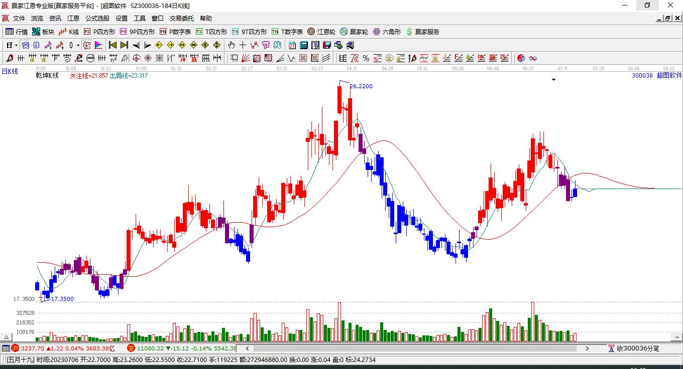 超圖軟件上漲遇阻 受藍(lán)色外軌線壓制 以上影中陽(yáng)線收盤(pán)