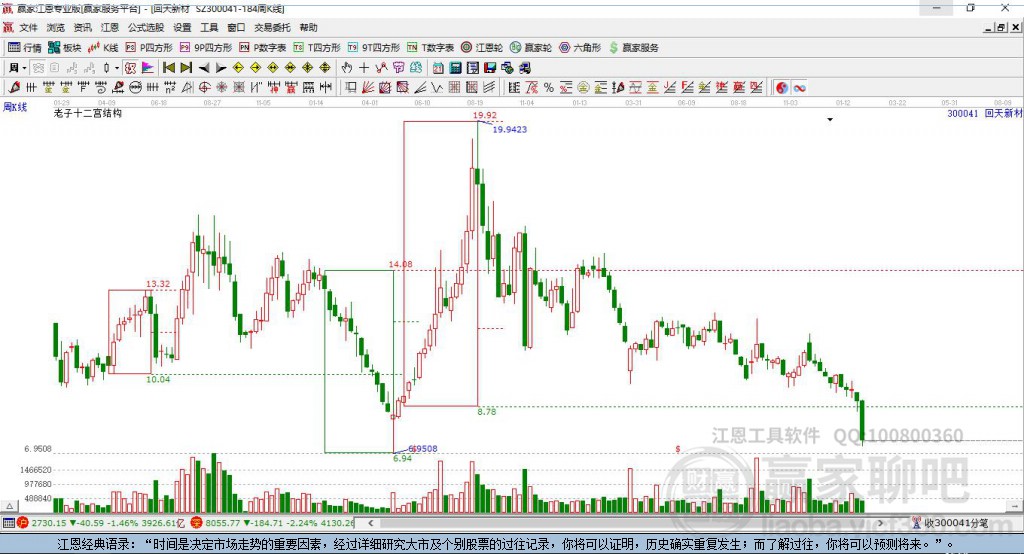 依據(jù)贏家江恩輪中輪價格模型工具展示,本周以陽線收盤,自近期高點13.49跌至本周,下跌了1.2點,受贏家江恩輪中輪三角形10.9點支撐。依據(jù)贏家江恩輪中輪規(guī)則,市場中三分位、四分位是一切市場周期運行的基礎(chǔ)。若股價繼續(xù)站穩(wěn)三角形關(guān)鍵位置,則有望反彈至上方四方形13.1位置。若繼續(xù)向下跌破三角形關(guān)鍵位置,將注意下方四方形支撐位9.81。