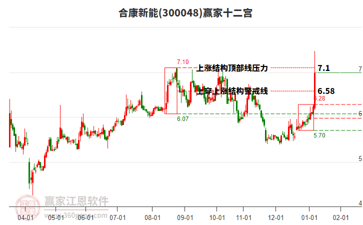 300048合康新能處于贏家江恩多頭次主線形態(tài),12月8日發(fā)出江恩筑底信號后,經(jīng)過60日,今日形成短期筑頂信號,短期多頭趨勢已被破壞,中長期多頭趨勢依舊保持。300048合康新能根據(jù)贏家江恩極反通道趨