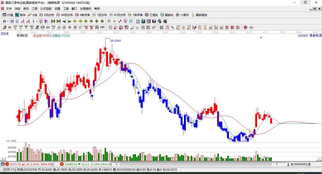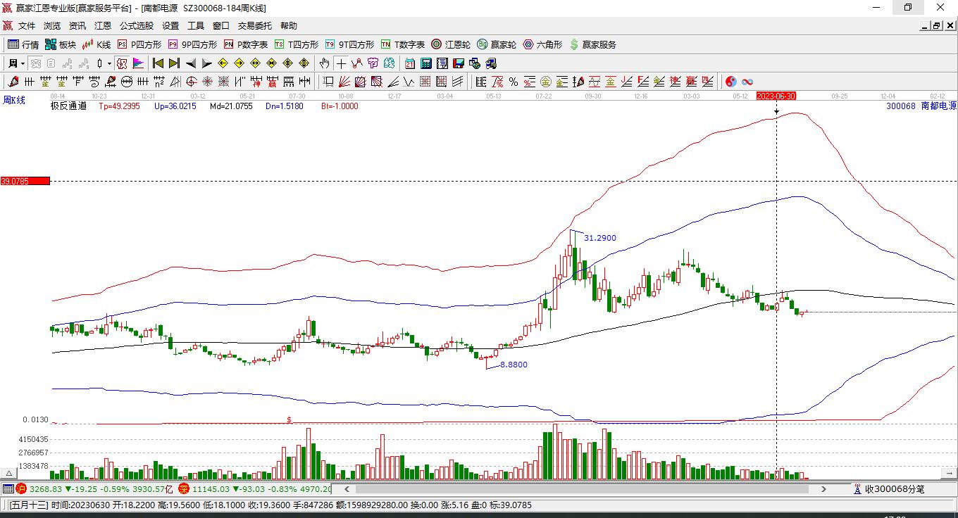 300068南都電源根據(jù)贏家江恩極反通道趨勢(shì)工具展示,上方壓力位17.0613,下方支撐位13.2932。300068南都電源處于贏家江恩空頭主線形態(tài),從1月14日形成頂分型后持續(xù)下跌,今日形成短期初