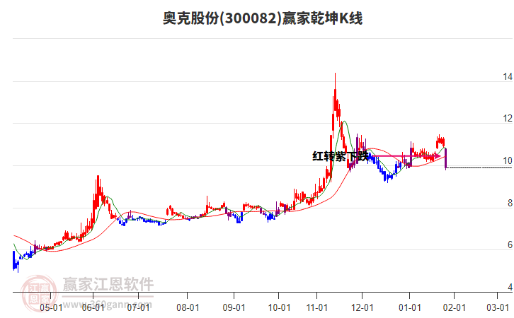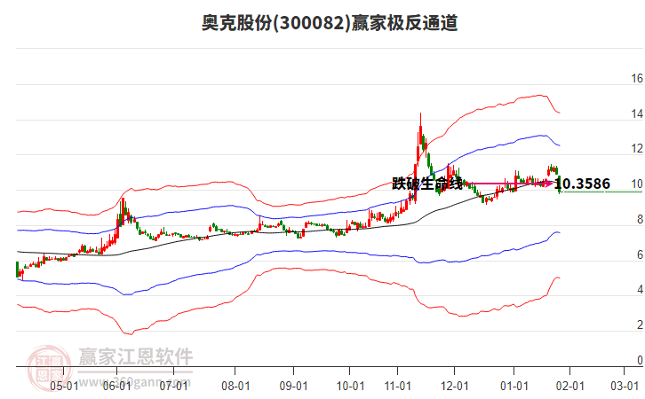 依據(jù)贏家江恩系統(tǒng)趨勢工具極反通道分析判斷奧克股份300082運(yùn)行在生命線以下弱勢區(qū)域,根據(jù)規(guī)則該股短線輕倉參與,股價(jià)跌至弱勢外軌線后波段再結(jié)合其它工具信號(hào)建倉。應(yīng)用口訣是:生命線上強(qiáng)勢走,生命線下難抬頭;紅黃兩條外軌線,壓力支撐顯勢頭。