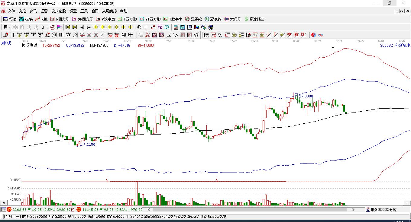 300092科新機(jī)電根據(jù)贏家江恩極反通道趨勢(shì)工具展示,上方壓力位18.9877,下方支撐位16.3246。300092科新機(jī)電處于贏家江恩多頭中期回調(diào)形態(tài),1月7日發(fā)出江恩筑底信號(hào)后,經(jīng)過20日,今日
