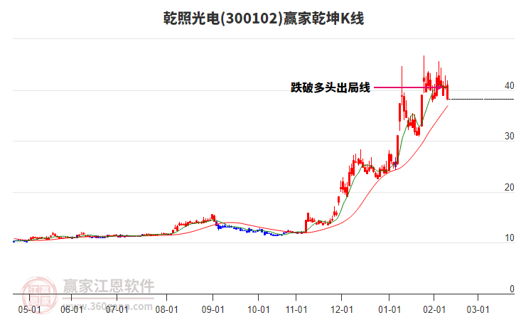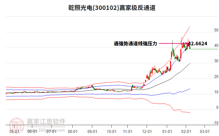 周一300102乾照光電最高價(jià)46.8上穿了贏家極反通道工具上方紅色外軌線,受到上方紅色外軌線強(qiáng)力壓制,最終收盤停留在在上方紅色外軌線與藍(lán)色外軌線上方的超強(qiáng)通道區(qū)域。300102乾照光電近10個(gè)交易日