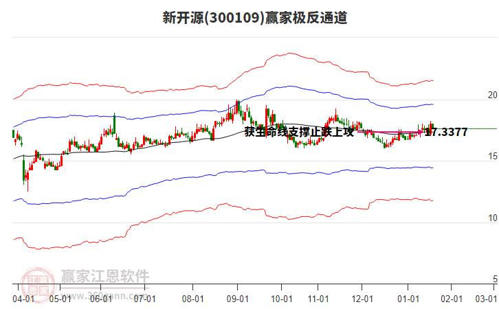 依據(jù)贏家江恩系統(tǒng)趨勢(shì)工具極反通道分析判斷新開源300109運(yùn)行在生命線以下弱勢(shì)區(qū)域,根據(jù)規(guī)則該股短線輕倉(cāng)參與,股價(jià)跌至弱勢(shì)外軌線后波段再結(jié)合其它工具信號(hào)建倉(cāng)。應(yīng)用口訣是:生命線上強(qiáng)勢(shì)走,生命線下難抬頭;紅黃兩條外軌線,壓力支撐顯勢(shì)頭。