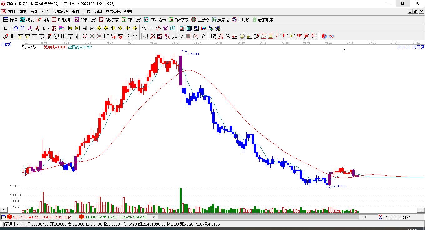 向日葵(300111)處于贏家江恩多頭次主線形態(tài),2月4日發(fā)出江恩筑底信號后,經(jīng)過7日,今日形成短期筑頂信號,短期多頭趨勢已被破壞,中期多頭趨勢延續(xù),但長期處于回調(diào)中。向日葵(300111)根據(jù)贏家江