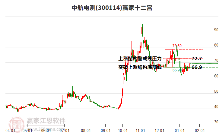 該股2月14日處在2024年12月20日形成的上漲結(jié)構(gòu)警戒線與底部線之間。警戒線72.7對當(dāng)前股價形成壓力。依據(jù)贏家十二宮多空能量守恒規(guī)則,上漲結(jié)構(gòu)警戒線附近容易形成多空能量爭奪區(qū)域。若股價突破站穩(wěn)警戒線,打破多空能量平衡,多方能量主導(dǎo)上攻,上方多空能量平衡位關(guān)注上漲結(jié)構(gòu)頂部線78.5。