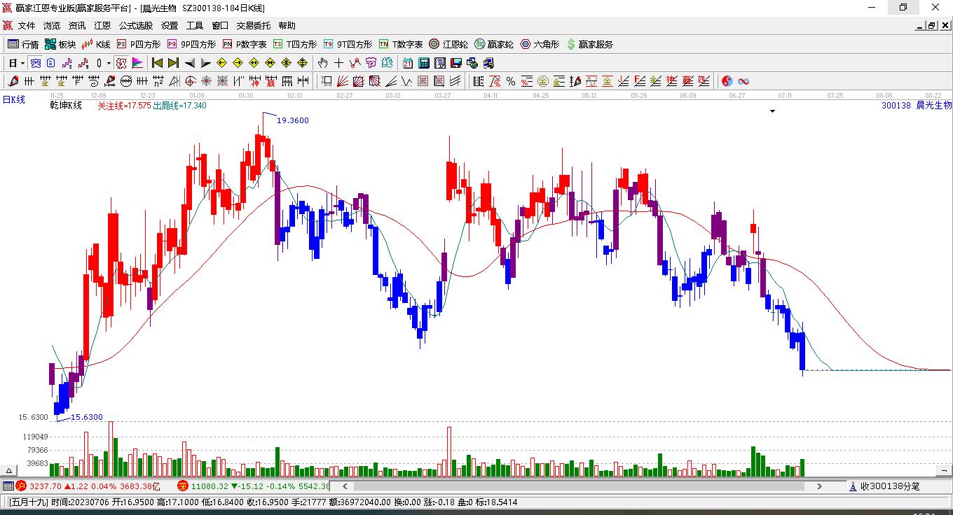 300138晨光生物最高價(jià)挑戰(zhàn)藍(lán)色外軌線 小幅上漲5.67%