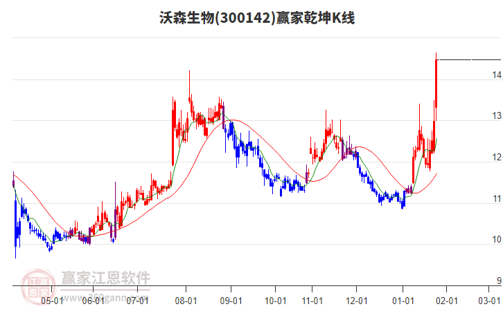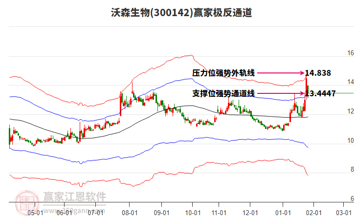1月23日300142沃森生物最高價(jià)13.5挑戰(zhàn)了贏家極反通道工具藍(lán)色外軌線,受到藍(lán)色外軌線強(qiáng)力壓制,最終收盤停留在在藍(lán)色外軌線與生命線上方的強(qiáng)勢(shì)通道區(qū)域。300142沃森生物近10個(gè)交易日漲幅7.1