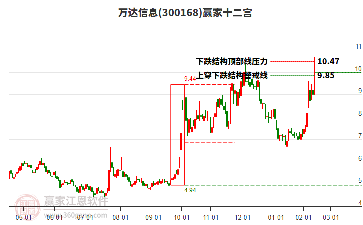 2月13日股價處在2026年1月14日形成的上漲結(jié)構(gòu)底部線與警戒線之間,今日股價微跌0.6%,目前處于底部線上方。依據(jù)贏家十二宮多空能量守恒規(guī)則,上漲結(jié)構(gòu)底部線位置是多空能量轉(zhuǎn)換的一個關(guān)鍵位置。如底部線6.34支撐不破,由多方能量主導(dǎo)上攻,在警戒線7.31尋找多空能量平衡。如跌破底部線,空方動能占據(jù)主導(dǎo),打開新的下跌空間。