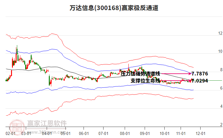 依據(jù)贏家江恩系統(tǒng)趨勢工具極反通道分析判斷萬達信息300168運行在生命線以下弱勢區(qū)域,根據(jù)規(guī)則該股短線輕倉參與,股價跌至弱勢外軌線后波段再結(jié)合其它工具信號建倉。應(yīng)用口訣是:生命線上強勢走,生命線下難抬頭;紅黃兩條外軌線,壓力支撐顯勢頭。