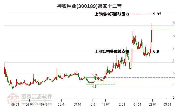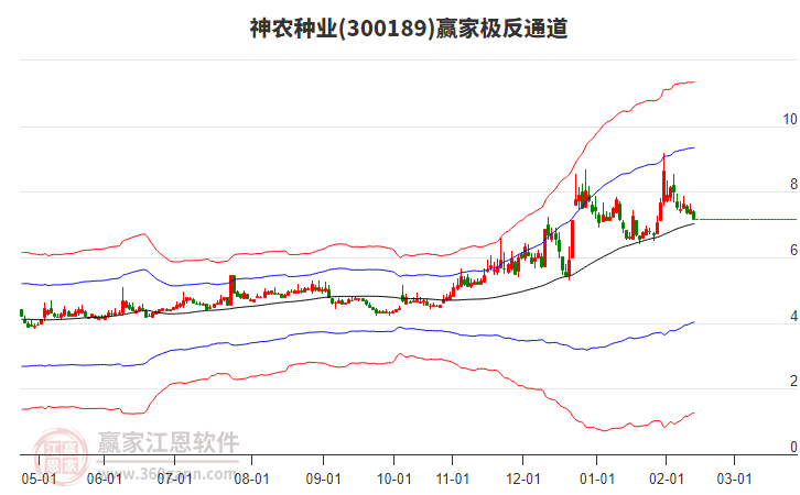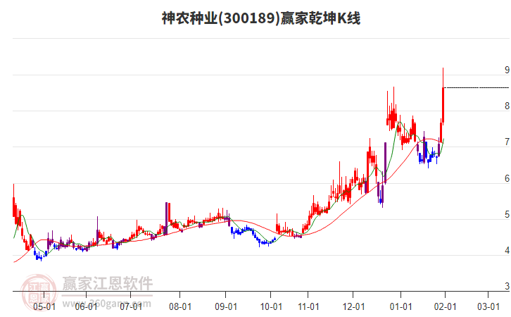 當(dāng)天神農(nóng)種業(yè)300189最高價(jià)9.2上穿了贏家極反通道工具藍(lán)色外軌線,受到藍(lán)色外軌線強(qiáng)力壓制,最終收盤停留在在藍(lán)色外軌線與生命線上方的強(qiáng)勢(shì)通道區(qū)域。神農(nóng)種業(yè)300189近10個(gè)交易日漲幅30.23%。