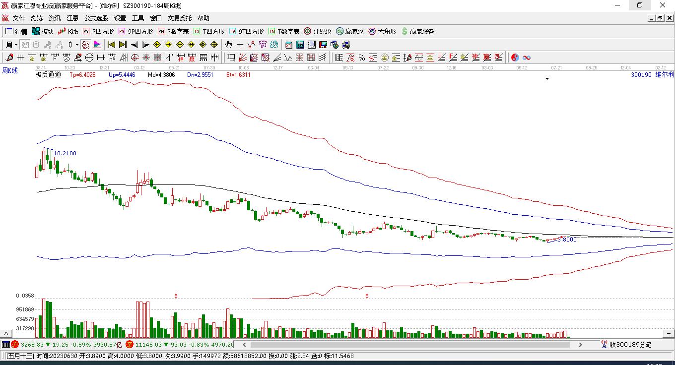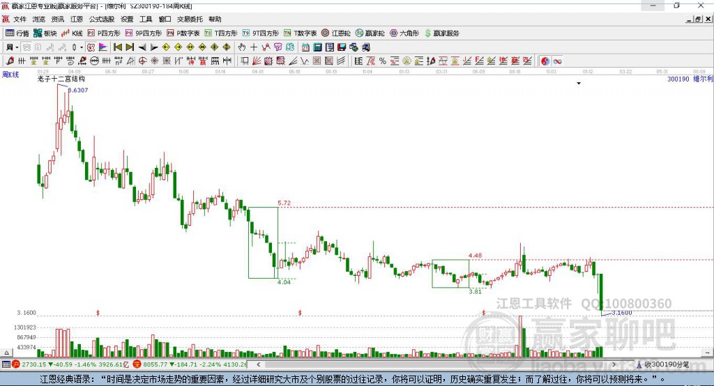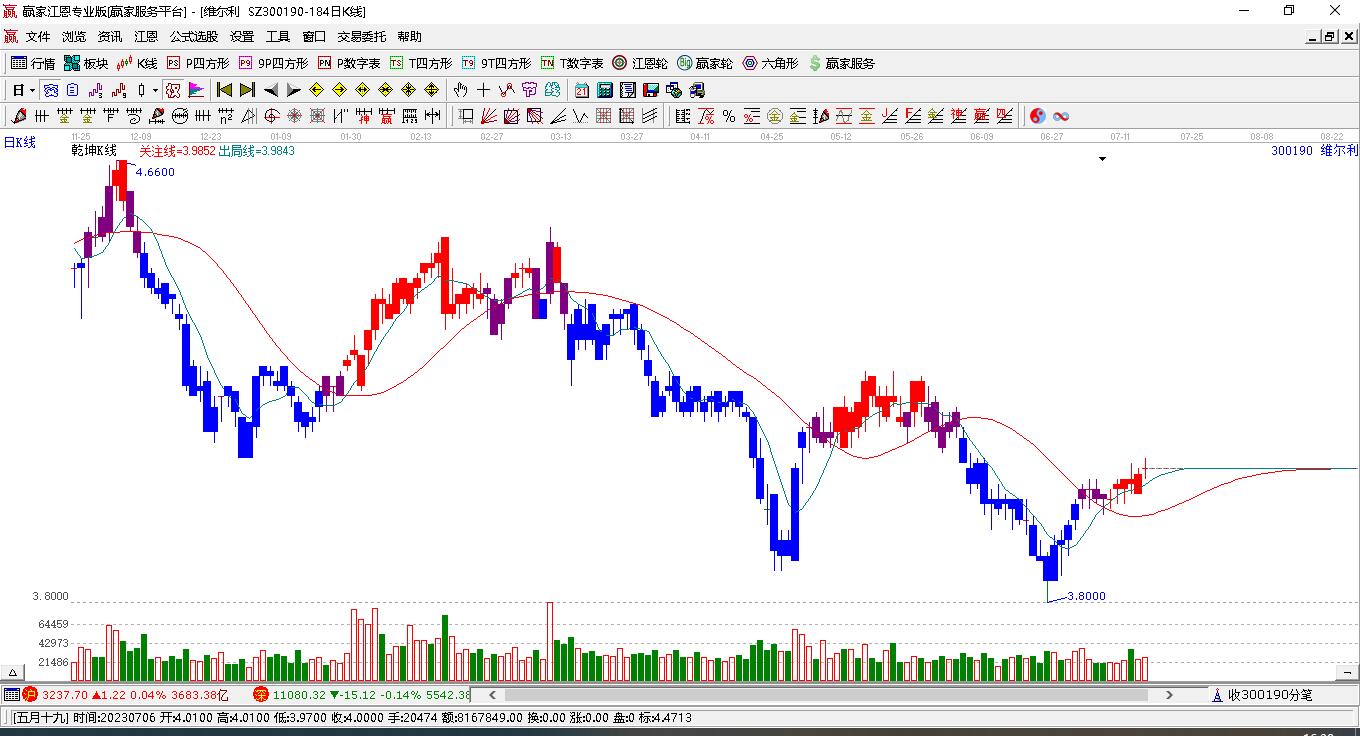 300190維爾利處于贏家江恩多頭主線形態(tài),1月14日發(fā)出江恩筑頂信號后,經過6日,今日再次發(fā)出江恩底分型并發(fā)出江恩筑底信號,中期雖然處于回調中,但長期多頭趨勢延續(xù)。維爾利今日低開,截止目前微漲0.8