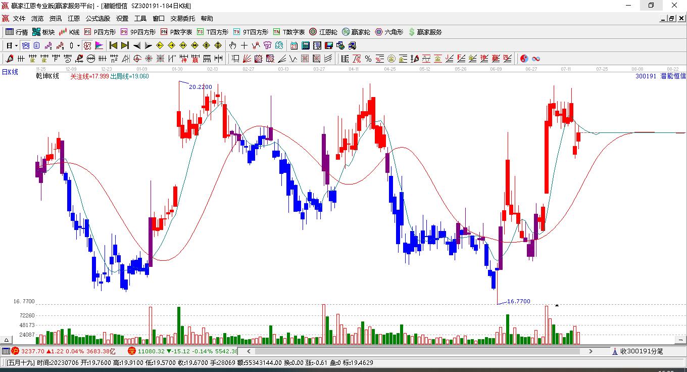 1月22日300191潛能恒信最高價(jià)24.96挑戰(zhàn)了贏家極反通道工具上方紅色外軌線,受到上方紅色外軌線強(qiáng)力壓制,最終收盤停留在在上方紅色外軌線與藍(lán)色外軌線上方的超強(qiáng)通道區(qū)域。300191潛能恒信近10