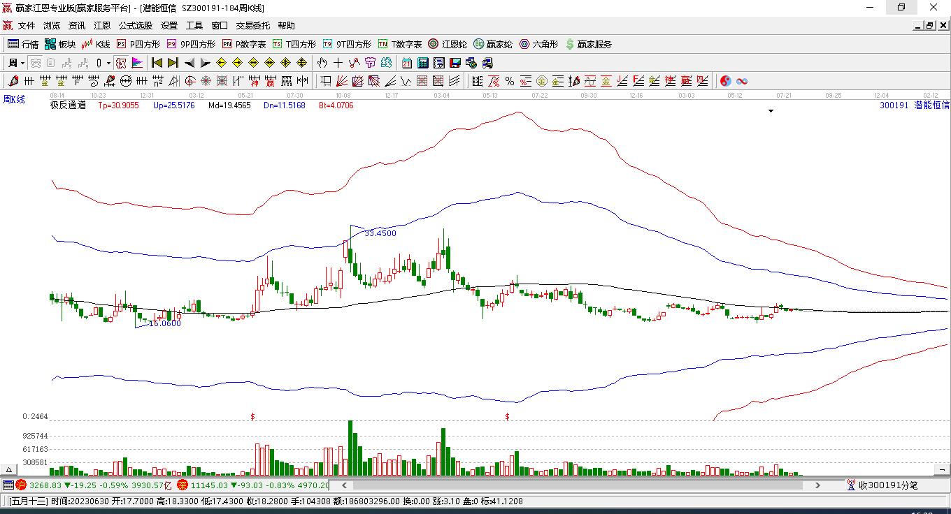 300191潛能恒信上漲遇阻 受上方紅色外軌線壓制 以上影大陽線收盤